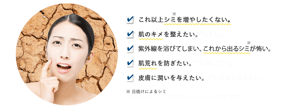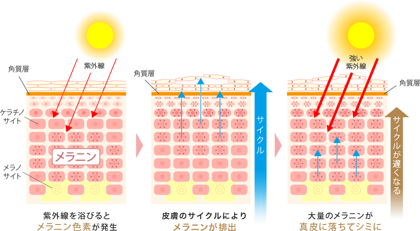 強い紫外線を浴びてメラニン色素が過剰に生成され、 ストレスなどにより内側のリズムが崩れると、 お肌の中の真皮にまでメラニンが落ちてシミになってしまうのです。